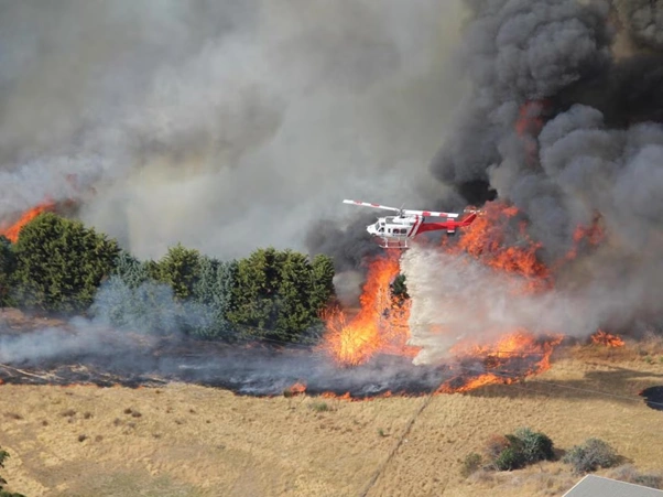 A firefighting helicopter dousing flames at a bushfire in Longwood