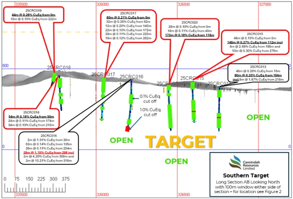 Figure 2: Long-section view facing north, displaying all 2025 drilling results. [Cannindah Resources]