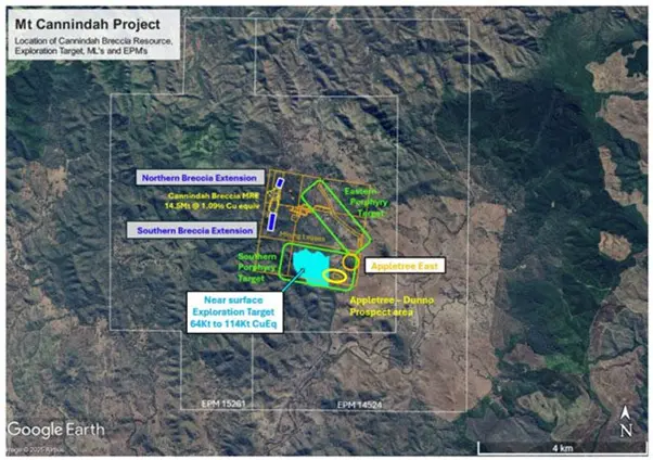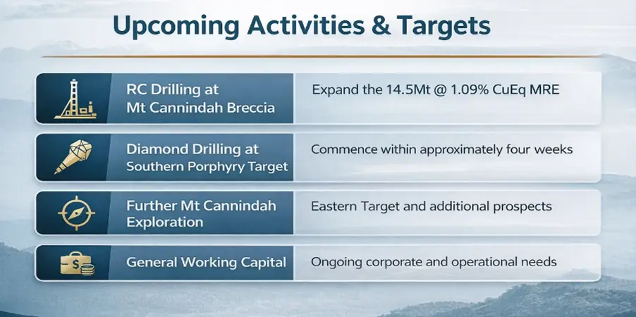 The fresh capital is earmarked for four main activities. The bulk goes toward expanding the existing Cannindah Breccia Mineral Resource Estimate, currently sitting at 14.5 million tonnes at 1.09% CuEq. RC drilling will target known high-grade extensions identified in the late-2025 campaign, particularly the near-surface zones that showed exceptional continuity.