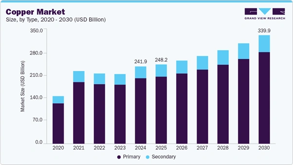 Figure 2: Global copper market size forecast from 2020 to 2030, highlighting steady growth in primary and secondary copper demand. [Source: Grand View Research]