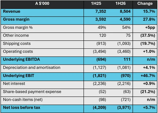 The half-year revenue figure of $8.50 million comprised $4.50 million in Q1 FY26 and $3.83 million in Q2 FY26. The softer Q2 result reflects a temporary maintenance outage at the Black Birch facility, which deferred approximately $0.9 million in Activated Carbon Pellet (ACP) deliveries. Those contracted volumes are being recovered in the current quarter.