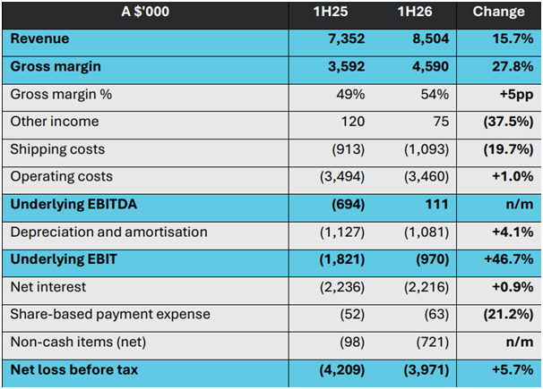 The swing to positive underlying EBITDA of $0.11 million, from a loss of $0.69 million in HY25, is a meaningful shift. It reflects the cumulative effect of pricing discipline, improved product mix, and cost containment measures put in place over the past 12 months.