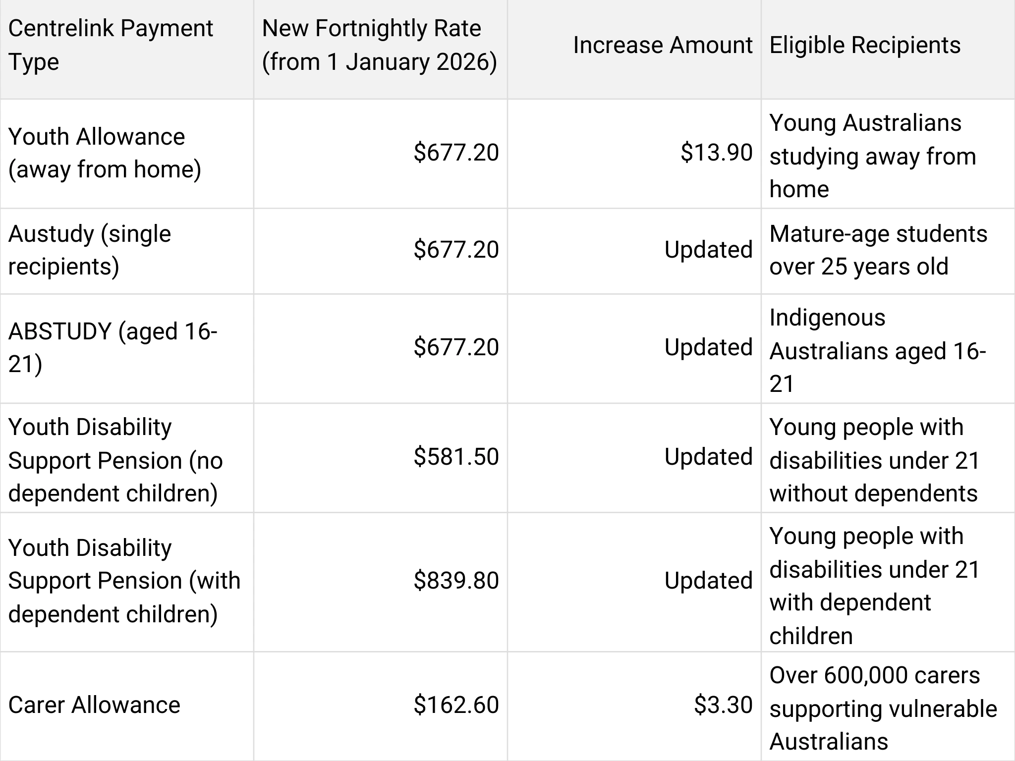 Recipients receiving current payments need not apply again for increased amounts. Centrelink will apply increased payments automatically from January 1, 2026. Existing recipients will observe the boost without further action required.