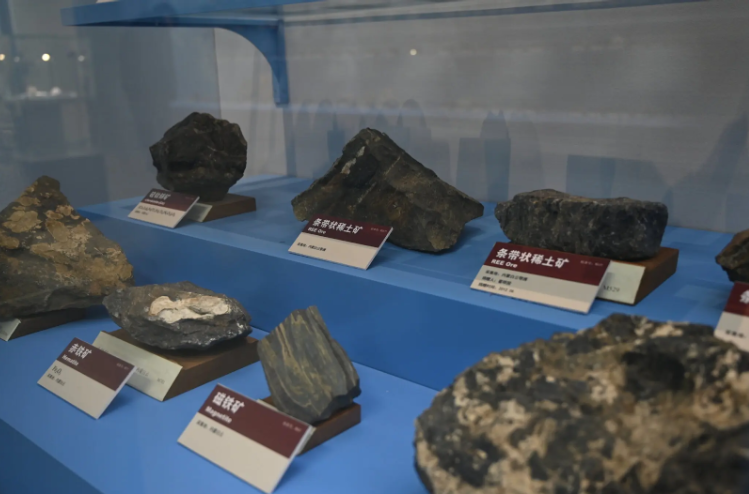 Samples of rare earth minerals from the Bayan Obo mining district on display at the Institute of Geology and Geophysics, Chinese Academy of Sciences, in Beijing in May 2025