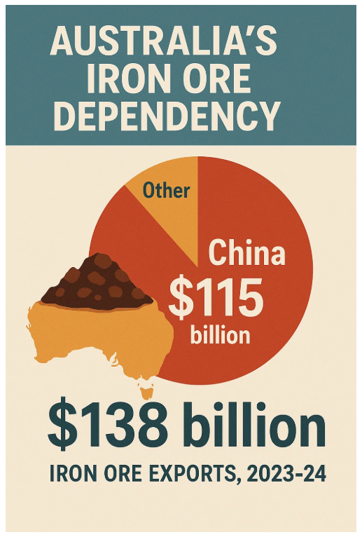 Australia exported $138 billion worth of iron ore in 2023-24, with China accounting for approximately $115 billion of that total. Iron ore represents nearly 60% of Australia’s merchandise exports to China, dwarfing other commodities like LNG ($10.8 billion) and coal ($2.2 billion).
