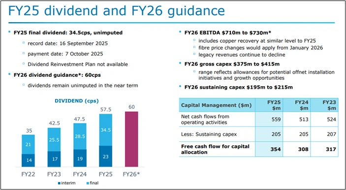 Chorus provided FY26 guidance indicating continued operational strength. The Company projects EBITDA between NZD 710 million and NZD 730 million for the full year. Sustaining capital expenditure is expected within the NZD 195 million to NZD 215 million range.