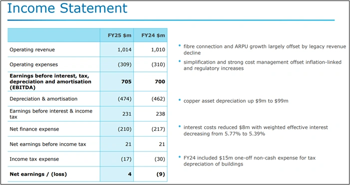 Copper retirement delivers substantial cost benefits. Direct copper operating expenses reduced to NZD 45 million in FY25 from NZD 54 million previously. The Company recycled 1,090 tonnes of cable, contributing NZD 3 million in revenue during a successful trial.