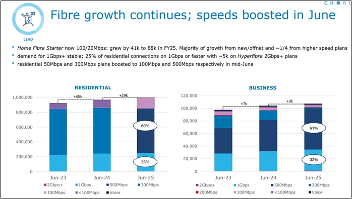 Chorus operates a highly reliable and scalable fibre network. The infrastructure proved resilient with 96% of data traffic flowing over fibre. Recent speed upgrades boosted residential 50 Mbps plans to 100 Mbps and 300 Mbps plans to 500 Mbps.