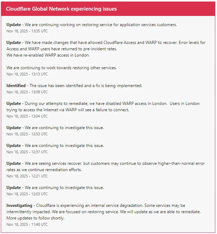 By 13:09 UTC, Cloudflare reported identifying the issue and implementing a fix. The company warned users to expect some turbulence as the solution proliferated across the internet.