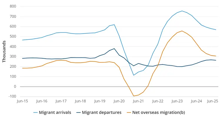 Net overseas migration to Australia, 2015 to 2025. [ABS]