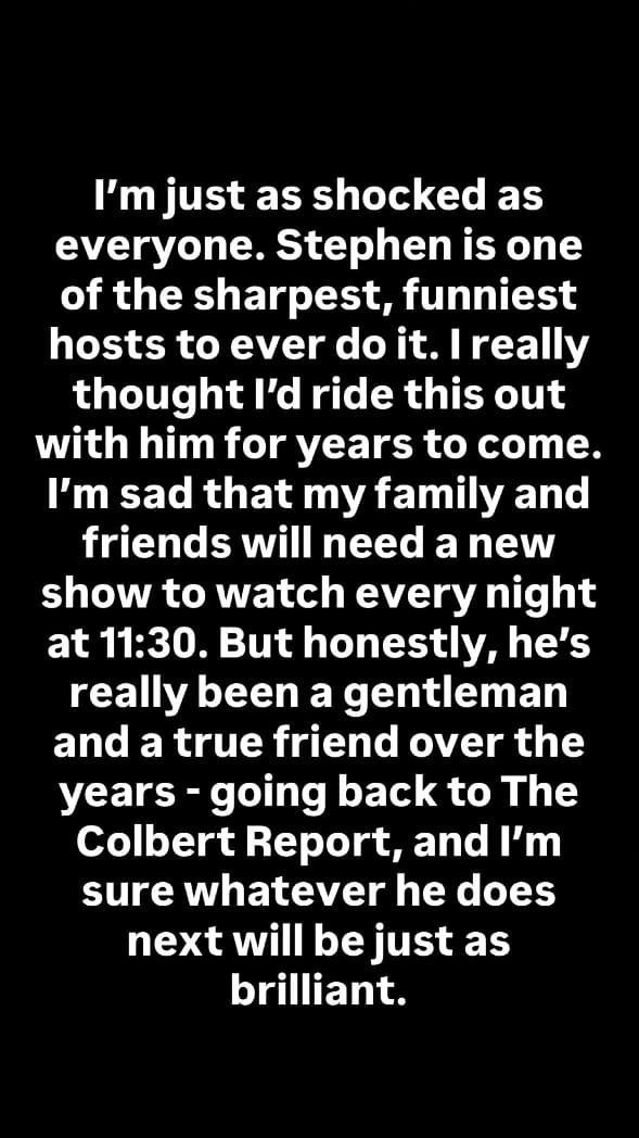 Fellow late-night hosts responded with public messages of frustration. Jimmy Kimmel posted, “love you Stephen. F*** you and all your Sheldons CBS.” Jimmy Fallon also weighed in, stating, “Stephen is one of the sharpest, funniest hosts to ever do it. I really thought I’d ride this out with him for years to come.”