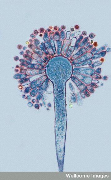 A micrograph of an Aspergillus spore, a type of fungus that produces cancer-causing aflatoxin