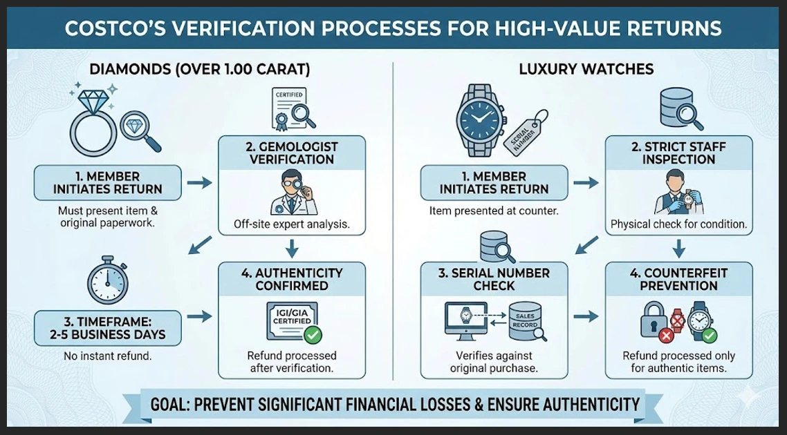 Costco applies extra rules for diamonds and watches. Gemologists must verify any stone over 1.00 carat. This process takes between two and five business days. The member must present all original paperwork. This includes IGI or GIA certificates. The company does not offer instant refunds for these items. Verification ensures the authenticity of the returned jewellery.