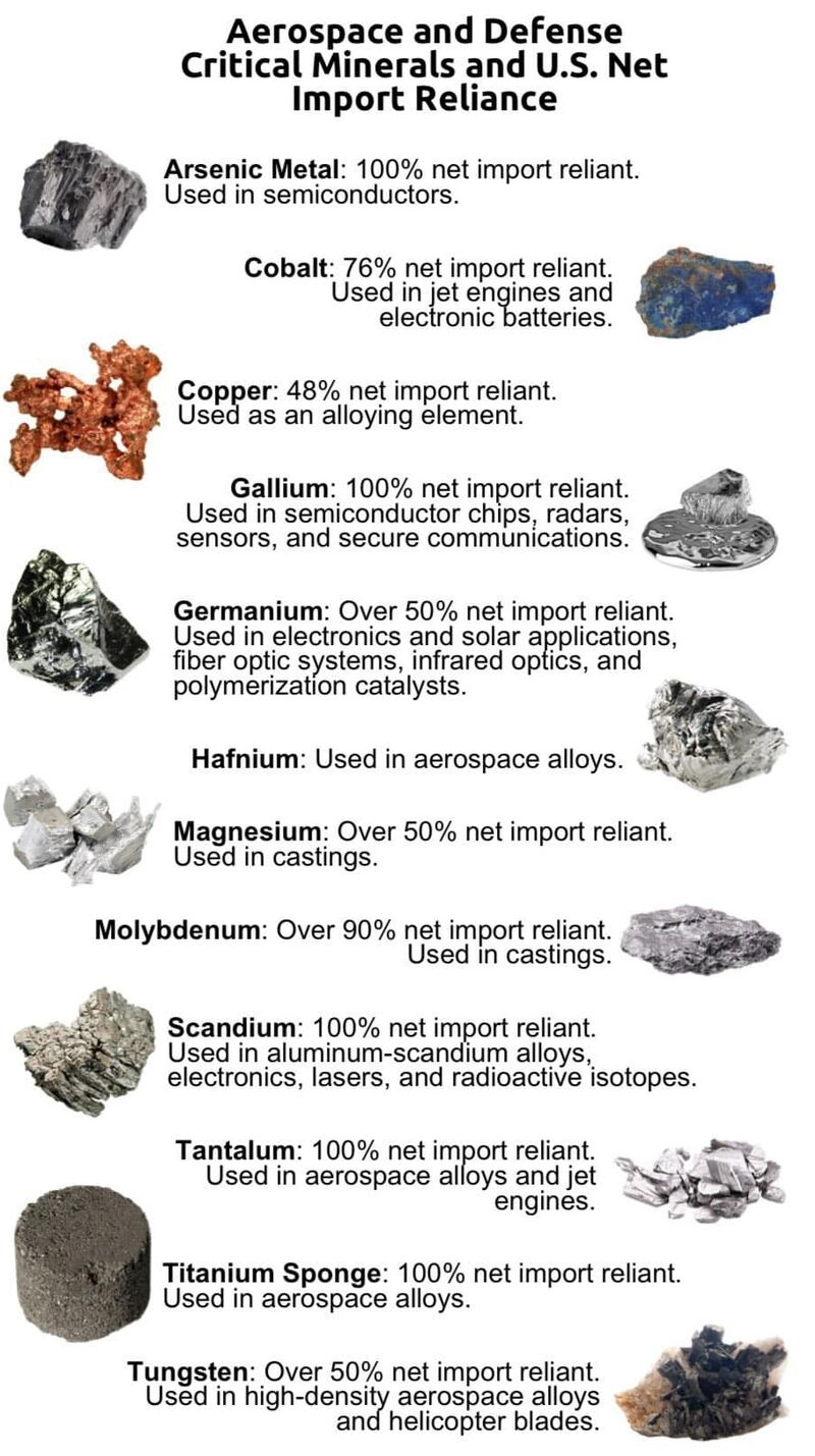 The U.S. is heavily dependent on imports for several critical minerals, including: