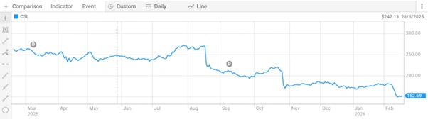 CSL shares closed at $152.610 per share on 18 Feb 2026. The Company holds a market capitalisation of $73.52 billion. The 52-week range sits at $149.850 to $275.790 per share, reflecting the significant correction CSL shares have experienced over the past year.