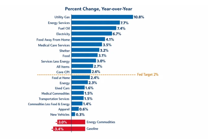 • Energy costs: Fell 2% monthly, with gasoline down 5.3%