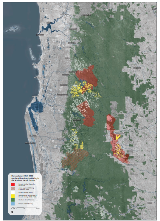 - Native vegetation data from WA’s DPIRD show an overall decline of 18,069 hectares in WA’s tall and medium forests during this period, 11,290 hectares due to bauxite mining.
