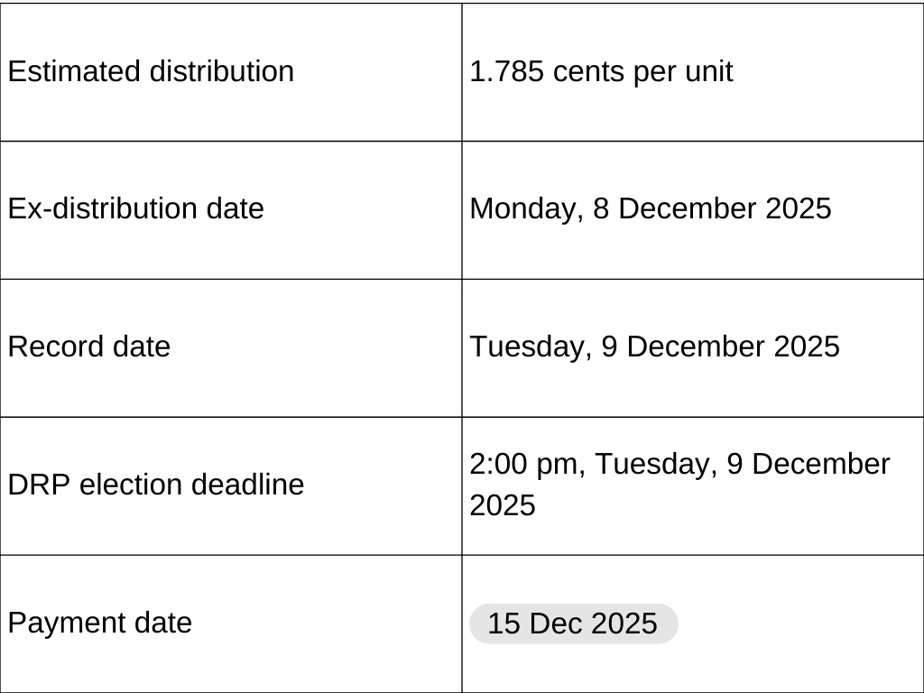 The distribution reinvestment plan (DRP) remains open, giving investors the choice to reinvest payments and grow their holdings over time.