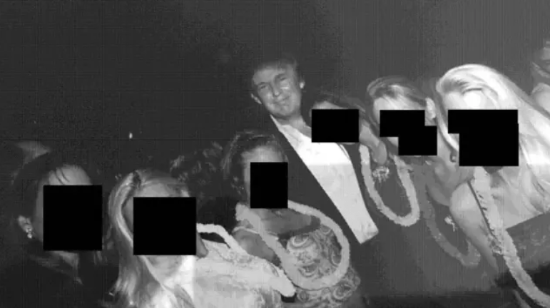 Among the newly released photos are several images of President Donald Trump. One shows him standing with a group of women whose faces were obscured before release. Another shows him positioned behind Epstein at an event, while a separate image shows him seated on a plane beside a woman whose face was blacked out.