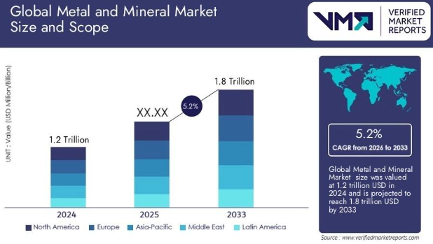The transition to clean energy has brought minerals such as lithium, cobalt, nickel, and rare earths into the strategic list. Governments see an assured supply as part of economic security. The global metal and mineral market was estimated at USD 1.2 trillion in 2024 and is forecast to expand to nearly USD 1.8 trillion by 2033. This growth reflects a projected compound annual growth rate (CAGR) of 5.2% between 2026 and 2033.