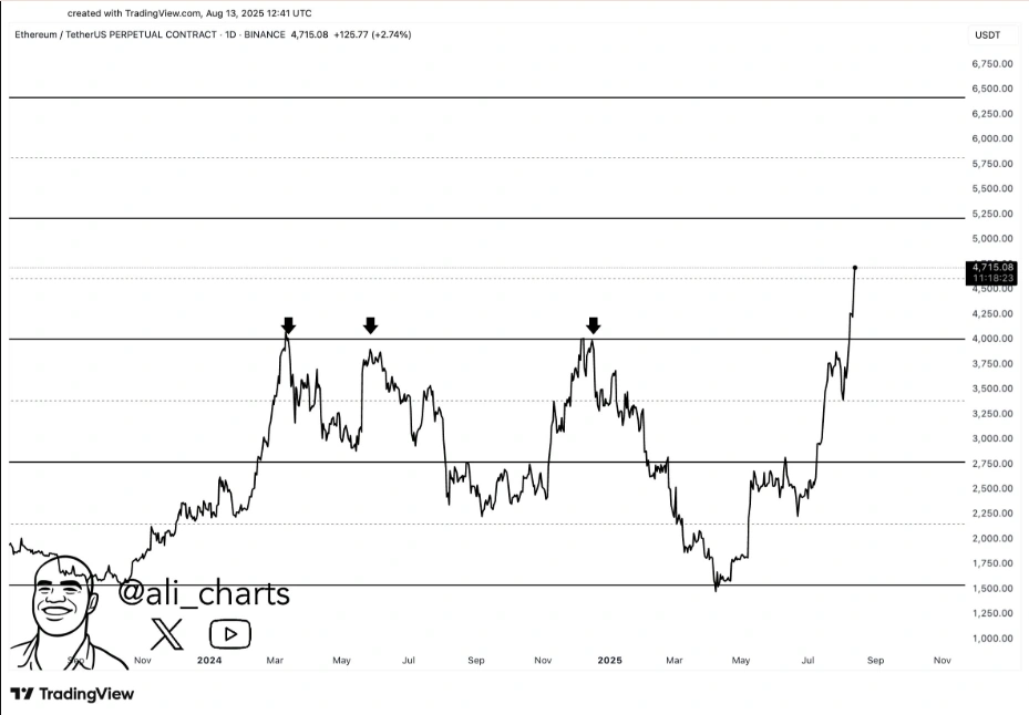 Technical analysis shows Ethereum has broken through the $4,250 resistance level for the first time in nearly two years. This level had previously triggered sharp reversals on multiple occasions. The sustained move above it has shifted sentiment in favor of further upside.