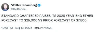 Standard Chartered has upgraded its year-end 2028 forecast for Ethereum to $25,000, a substantial increase from its previous target of $7,500. The revision comes after the cryptocurrency’s strong performance and the recent surge in inflows to Ethereum-focused exchange-traded funds.