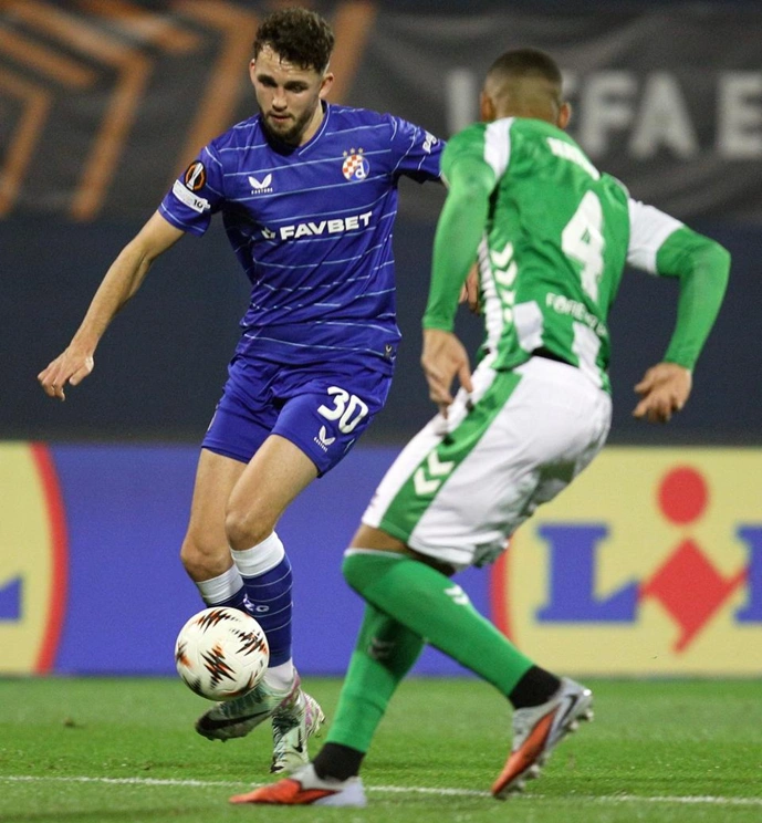 Figure 5: Dinamo Zagreb defender attempts to advance the ball under pressure from the Real Betis frontline during the Europa League encounter.