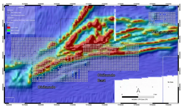 The sampling program is in progress at three main targets: Chikundo, Chikundo East and Nangurugia. These areas have been discovered through the combination of previous geochemistry, structural interpretation and visual signs of malachite and chalcopyrite in artisanal activities.