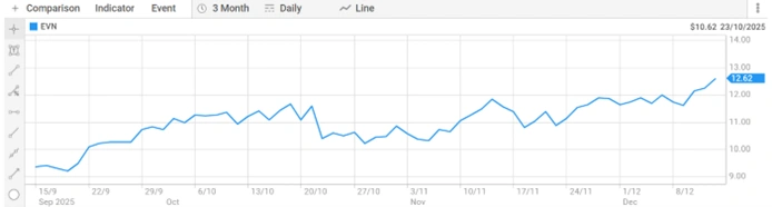 Evolution Mining shares traded at AUD 12.615 as of the recent market close. The stock recorded a 52-week range between AUD 4.610 and AUD 12.810 per share.