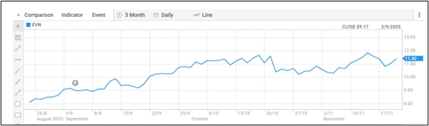 Figure 6: EVN share price chart showing strong upward momentum over the past three months.