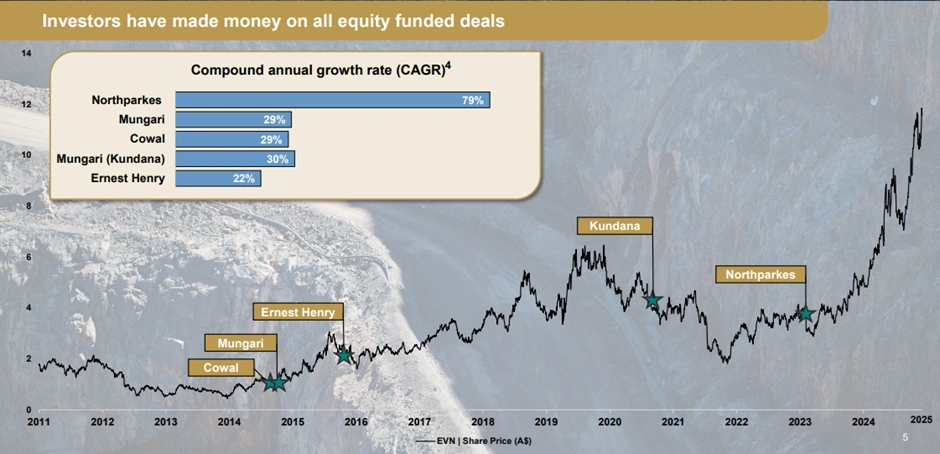 Figure 4: Long-term EVN share price performance showing value creation across all major portfolio acquisitions.