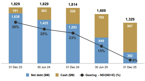 The group cash balance rose to $967 million, an increase of $187 million, while the gearing was improved to 6%, in comparison to 11% at 30 September 2025 and 33% at 31 December 2023.