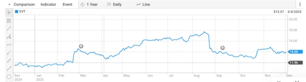 EVT shares closed at AUD 14.00 on 2 December 2025. The stock trades within a 52-week range of AUD 10.94 to AUD 17.99. Market capitalisation stands at AUD 2.24 billion.