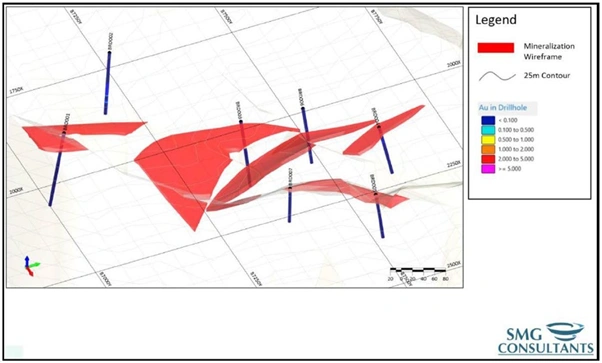 Figure 4: Oblique perspective showing stacked mineralisation wireframes and historic drill holes at the Sua Prospect that underpin the current JORC (2012) inferred mineral resource estimate. [Far East Gold]