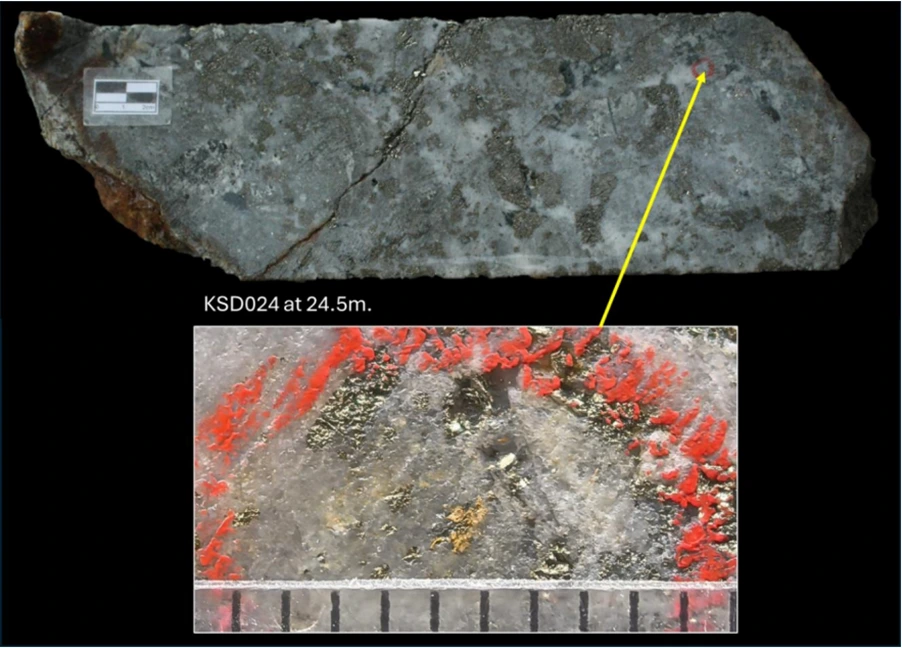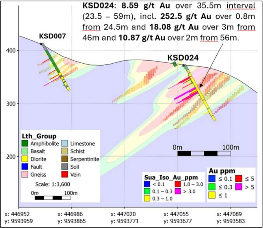 Drillhole KSD024 confirms the extension of bonanza-grade mineralisation 25 metres east from the previously reported KSD023, which returned 180 g/t Au over 0.4 metres within 13.77 g/t Au over 9.8 metres.