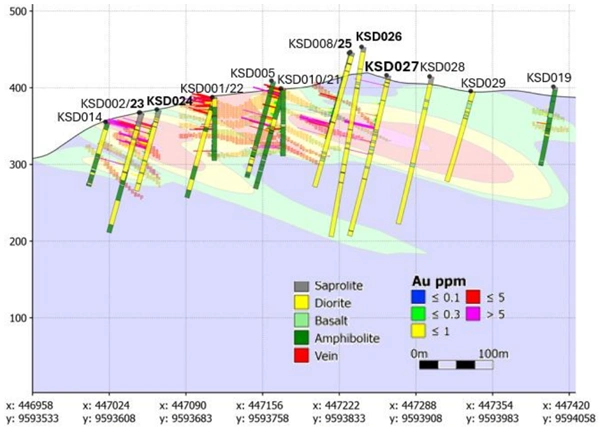 KSD027 was drilled to test the same mineralised zone as historical holes KSD012 and KSD016, which were drilled up-dip at shallower depths. Notably, those historical holes returned only low-grade intersections of less than 1 g/t Au.