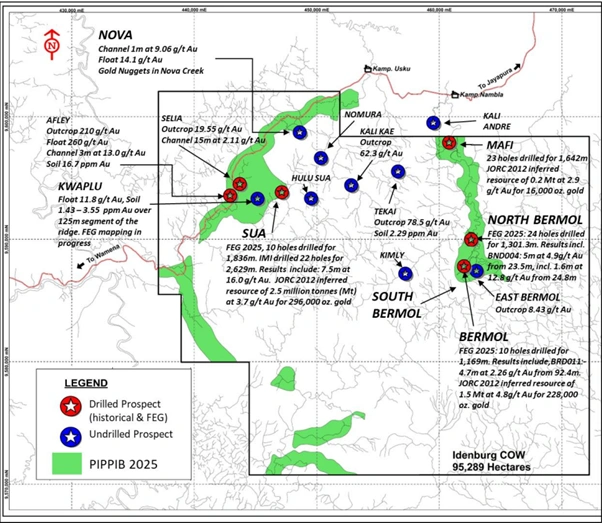 The Sua Prospect sits within the approximately 5-kilometre-long Sua-Afley shear zone, a prominent structural corridor that remains largely underexplored. The Idenburg Project hosts a JORC 2012 Inferred Mineral Resource of approximately 540,000 ounces of gold at an average grade of 4.1 g/t Au across multiple prospects.
