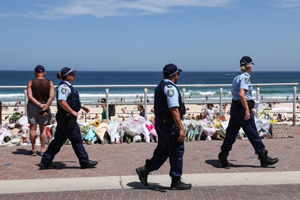 Figure 1: Police officers patrol Bondi Beach following a deadly attack in Sydney.