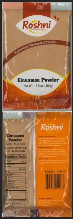 • Roshni Foods Cinnamon Powder, UPC code: 6251136 034139, Best by date: 02/09/25