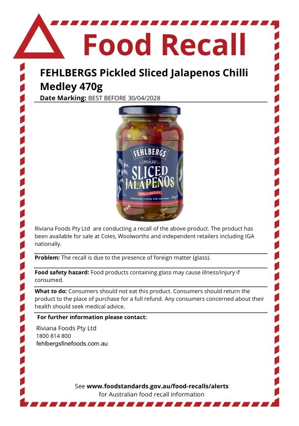 Riviana Foods Pty Ltd has issued a nationwide recall of Fehlbergs Pickled Sliced Jalapenos Chilli Medley in 470g jars. The recall was announced on 14 October 2025 by Food Standards Australia New Zealand (FSANZ). The product is available for sale at Coles, Woolworths, and independent retailers including IGA across Australia. The affected product carries a best-before date of 30 April 2028. The recall results from the detection of foreign matter, specifically glass fragments, in the product. FSANZ warns this may cause illness or injury if consumed.