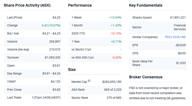 As of June 09, 2025, Findi Limited (ASX: FND) is trading at AUD 4.25 per share, within a 52-week range of AUD 3.06 to 8.30. The Company’s current market capitalisation stands at approximately AUD 263 MILLION, with 62 MILLION shares on issue.
