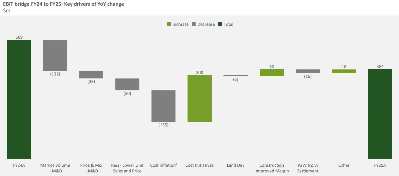 Fletcher Building recorded revenue of NZD 7.0 billion for the 12 months ended 30 June 2025. This is 9% down from NZD 7.683 billion in FY24. The company reported an EBIT of NZD 384 million, compared to NZD 509 million in the previous year.