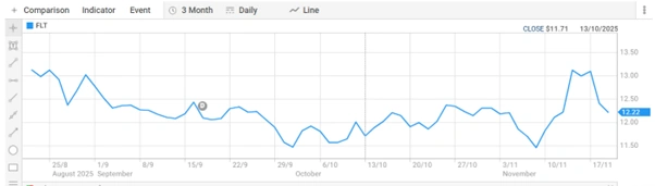 Flight Centre shares traded at AUD 12.26 per share with a 52-week range of AUD 11.41 to AUD 18.14 per share. Market capitalisation stood at AUD 2.65 billion at the recent close. The stock demonstrated volatility during FY25 as geopolitical tensions and macroeconomic uncertainty affected consumer travel demand.