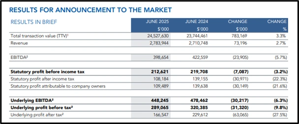 Flight Centre Travel Group delivered a total transaction value of AUD 24.5 billion for the year ended 30 June 2025. The company generated group revenue of AUD 2.8 billion during FY25. Underlying profit before tax reached AUD 289.1 million, representing a decline from AUD 320.4 million in the prior year.