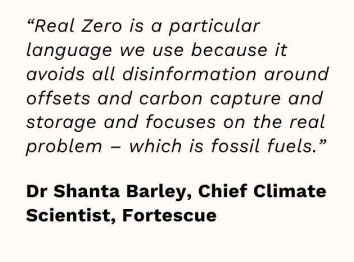 Fortescue’s “Real Zero” targets fossil fuels, not offsets — Dr Shanta Barley.