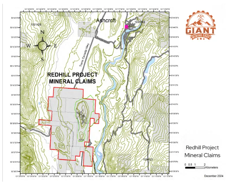 The Redhill Property sits south of Ashcroft, British Columbia, within the Kamloops Mining District. The Trans-Canada Highway provides direct access to the site, reducing logistical challenges for exploration and future development.