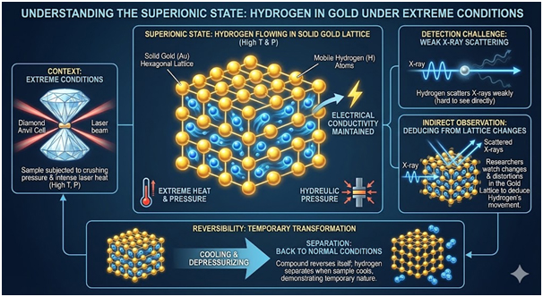 Under extreme pressure and heat, hydrogen entered a superionic state within the gold compound. This state allows atoms to move like liquid inside solid structures. The hydrogen atoms maintained electrical conductivity throughout the gold hydride material. Hydrogen typically scatters X-rays very weakly, making direct observation challenging.