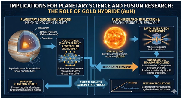 Interior models of Jupiter suggest metallic hydrogen surrounds a dense core beneath crushing pressures. These environments experience pressures far beyond anything found on Earth’s surface. Recent research demonstrated that superionic states in water and silica hydrogen mixtures explain magnetic fields in giant planets. Gold hydride offers a controlled environment where scientists can measure dense hydrogen’s structure and motion.