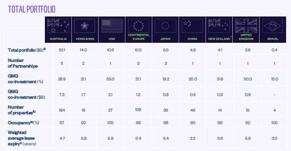 - Australia: AUD 32.1 billion across 184 properties