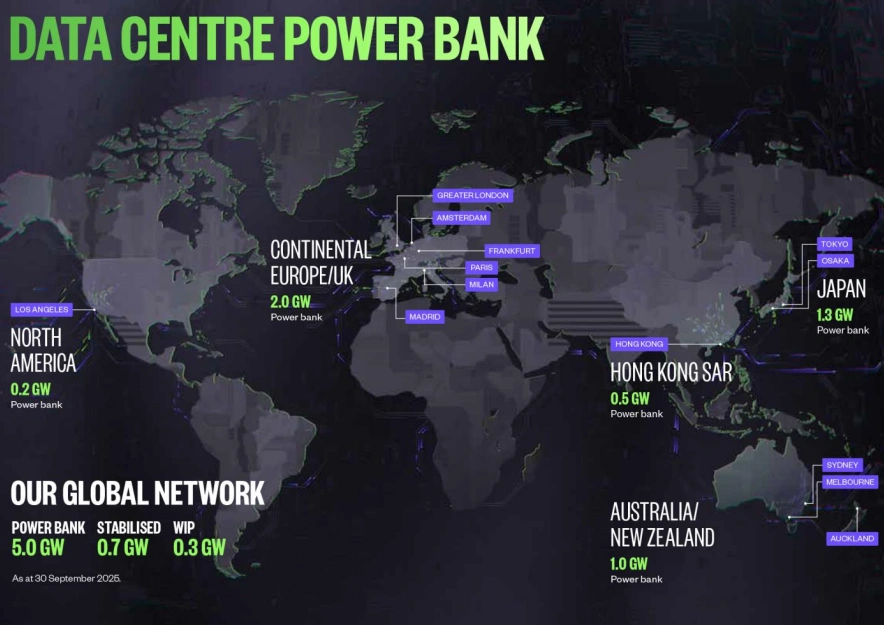 Data centres represent 68% of development work in progress, approximately AUD 8.4 billion. The company maintains a global power bank of 5.0 gigawatts and expects to commence projects totalling 0.5 gigawatts by June 2026 with an estimated end value of AUD 13.0 billion.
